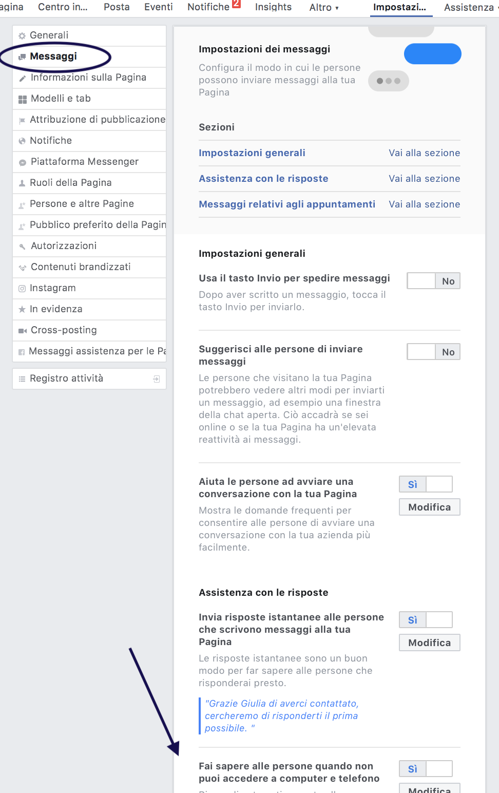Per prima cosa, però, dovrai impostare un messaggio ad hoc che potrà fornire informazioni utili ai tuoi fan che scriveranno quando tu sarai assente.